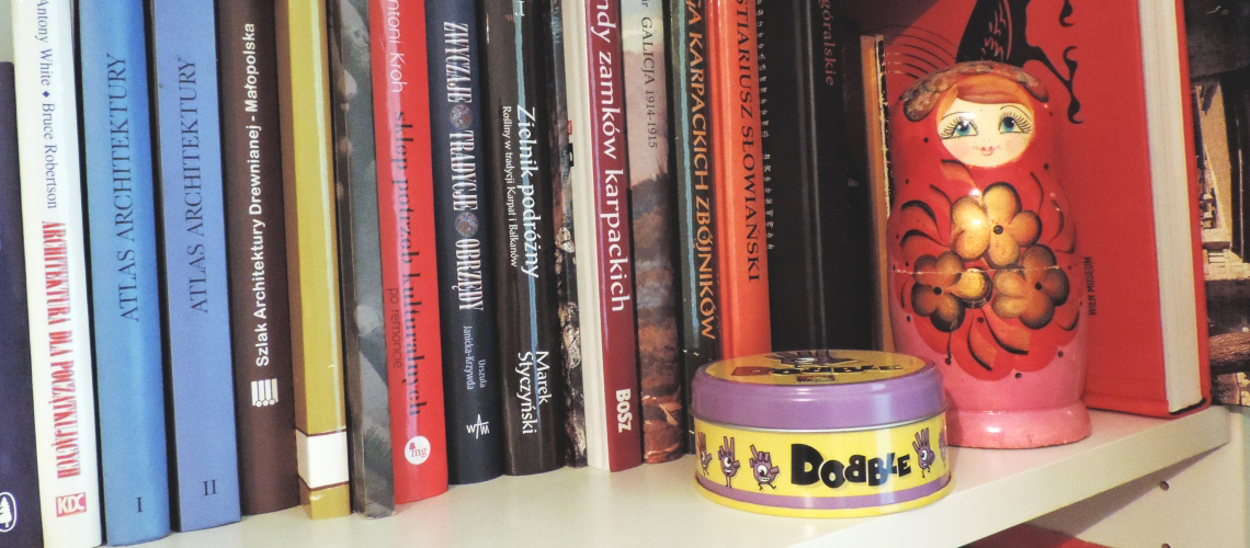 Natura nie lubi próżni, dlatego miejsce, które zwolniło mi się po poprzednich książkach, szybko zajęły inne, związane z Kursem Przewodnika Beskidzkiego, który od 8 miesięcy pochłania całą moją uwagę. Tym oto sposobem na mojej półce wylądowała seria przewodników Rewasza, książki o architekturze, etnografii (moje ulubione) oraz związane z historią, tak Polski, jak i regionu. W tym momencie to chyba moje ulubione książki, mam jednak z nimi jeden, podstawowy problem – nie mam kiedy tego wszystko czytać, choć powinnam 😉 Porządku pilnuje matrioszka znaleziona na targu staroci w Bułgarii. Dobble z kolei rozkręca każdą, najnudniejszą nawet imprezę. Warto mieć pod ręką.